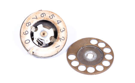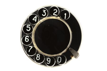 Black rotary dial (with white numbers 1-10) from a vintage telephone. Isolated on white background without telephone.