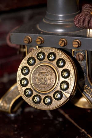 Retro phone with rotary dial. Vintage telephone old style, close up