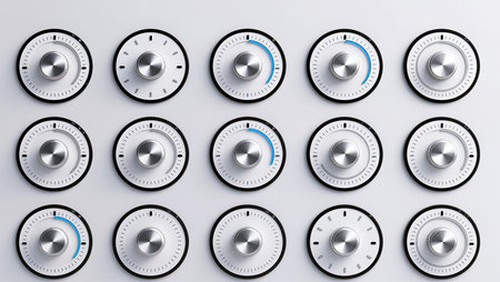 A series of shiny dials displays various positions on a clean, minimalist wall.
