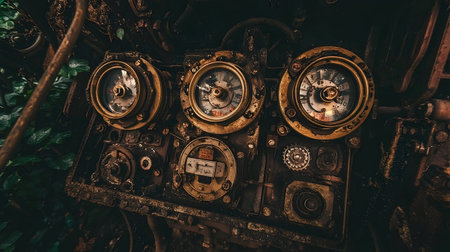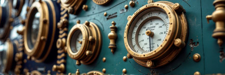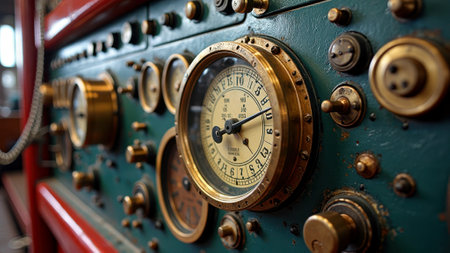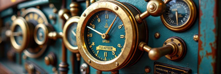 Vintage brass nautical control panel with gauges and knobs. That the image is generated using AI.