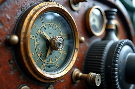 Antique nautical compass and dials on rusted ship dashboard. That the image is generated using AI.