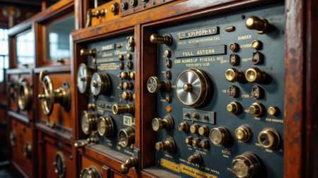 Vintage ship navigation equipment with dials and gauges on wooden panels. That the image is generated using AI.