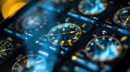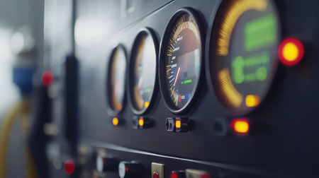 A close-up view of the engine's control panel, showcasing gauges and dials with a soft-focus background, highlighting the intricate details and functionality of aviation technology. --ar 16:9 --v 6 Job ID: df9d47c2-9e8f-46c5-9a89-147cc299fa22