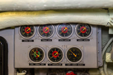 Cherbourg-Octeville, France - May 22, 2017: Detailed view of control devices inside of the Nuclear submarine Le Redoutable of French Navy in the