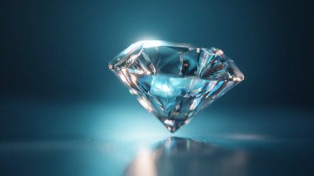 The image features a meticulously cut diamond, brilliantly illuminated and positioned on a textured surface. Its facets refract light, creating a dazzling display of brilliance. The cool blue tones evoke elegance.