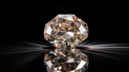 A meticulously cut diamond rests on a reflective, dark surface. The gemstone's facets catch and refract light, creating brilliant sparkles and a sense of luxury and opulence.