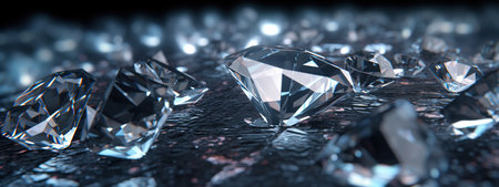 White diamonds gemstone closeup background in dark colors wide long banner format. Precious jewel stones sparkling with spectrum gleam macro on dark surface. AI Generative content