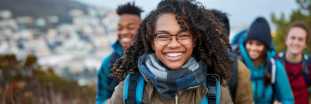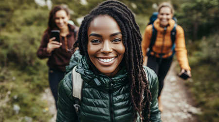 Group of diverse friends hiking in nature, smiling and enjoying a sunny day outdoors.