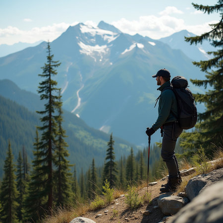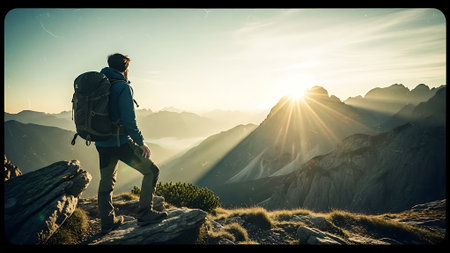 Man with backpack standing on a mountain trail at sunrise, overlooking a stunning panoramic view