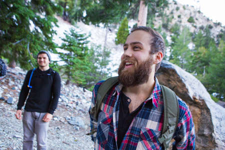Two caucasian male friends on vacation walking in the wilderness embracing nature