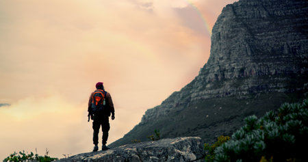 Hiker with backpack standing on top of a mountain and looking at the sunrise