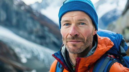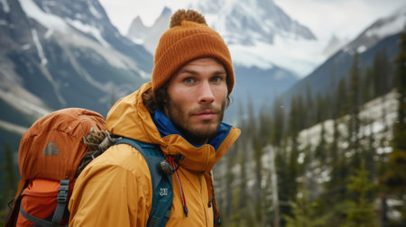 Smiling Hiker Enjoying Mountain Trek with Backpack and Hat on Sunny Day.