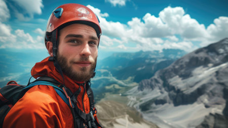 The picture of the caucasian male is prepare to paragliding from the peak of the mountain under the blue sky with cloud, the paragliding require skill paraglide knowledge and flight equipment. AIG43.