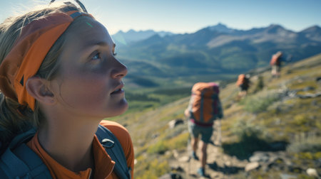 A group of travelers hiking up a beautiful mountain, surrounded by natural landscapes filled with plants, grasslands, and hills, under a vast sky. AIG41