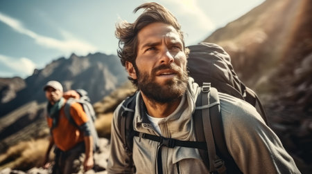 The picture of the mountaineer is walking on mountain hill that has been taken from the front, the mountain climber require skill physical endurance, training, climbing safety and experience. AIG43.