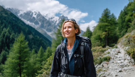 An active woman enjoys solo hiking in the stunning landscapes of Norway. Surrounded by majestic mountains and glaciers, her adventurous spirit shines through as she explores the breathtaking scenery.