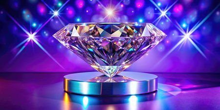 Large, sparkling diamond sits on a glittering purple surface, reflecting light and color in a mesmerizing display of luxury and brilliance, creating a captivating vertical composition