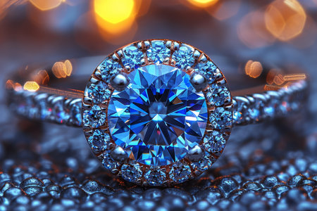 This stunning close-up of a diamond engagement ring with a brilliant cut showcases its exquisite detail, beautifully complemented by blue decorative beads, perfect for love and celebration.