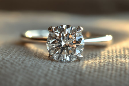 A beautiful diamond engagement ring sits on a textured fabric surface, illuminated by soft ambient light that enhances its brilliance.