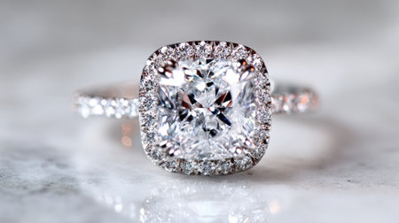 A beautiful diamond engagement ring is displayed with a dazzling halo on a smooth marble surface. The intricate design highlights its brilliance and elegance, perfect for special moments.