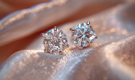 A close-up view of sparkling diamond stud earrings resting on a plush velvet fabric, with soft lighting accentuating the brilliance and clarity of the stones