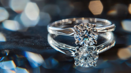 A brilliant-cut diamond engagement ring on a glossy mirrored surface, reflecting the intricate sparkle of the stone and band.