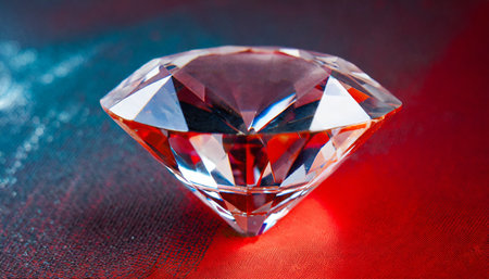 A stunning close-up of a crystal diamond resting on a dark surface, highlighted by vibrant red and blue bokeh lights, creating an enchanting atmosphere.