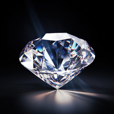 The image features a meticulously cut diamond, brilliantly illuminated and positioned on a textured surface. Its facets refract light, creating a dazzling display of brilliance. The cool blue tones evoke elegance.