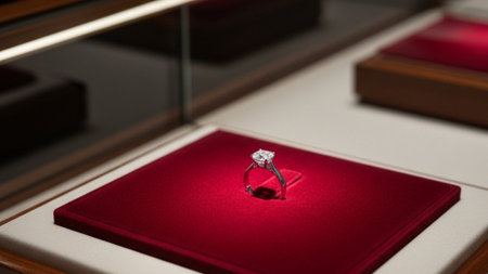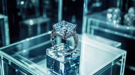 Captivating image of a stunning diamond ring showcased in a glass display, highlighting the brilliance and craftsmanship of fine jewelry with elegant reflections.