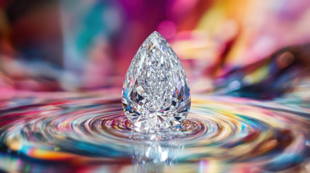 A stunning tear-shaped diamond rests atop a colorful water surface, creating a mesmerizing effect with reflections and vibrant hues, ideal for luxury themes.