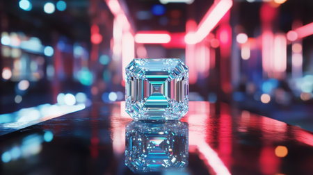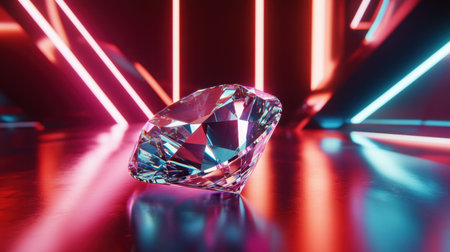 A stunning diamond sits on a reflective surface, illuminated by vibrant neon lights, creating a captivating modern abstract environment. Perfect for luxury themes.