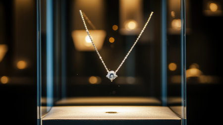 A stunning diamond necklace displayed elegantly under soft lighting in a luxury jewelry store, highlighting its intricate design and exquisite craftsmanship.