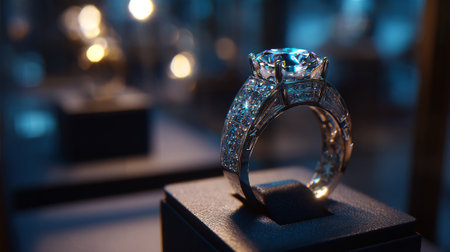 Luxurious diamond ring shimmering under spotlights, a symbol of wealth and elegance.