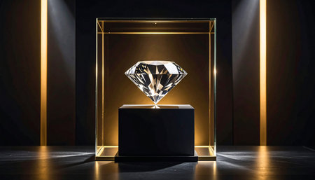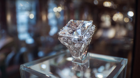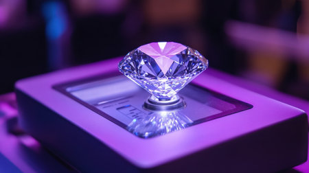 Explore the brilliance of a flawless diamond showcased on an elegant exhibition stand. Mesmerizing beauty in every facet, Generative AI