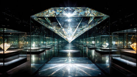 An interior shot showcases a large diamond display within a museum. The scene features a central, giant diamond, illuminated against a dark background, surrounded by reflecting glass and exhibits. The composition utilizes symmetry and perspective, creating a sense of depth. This image is suitable for editorial or commercial applications, highlighting luxury and value.