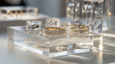 A minimalist jewelry box made of clear crystal displaying a sophisticated selection of delicate diamond studs and solitaire rings