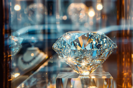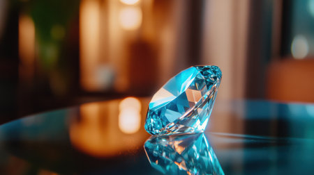 Large, sparkling diamond resting on a dark blue reflective surface, creating a luxurious and elegant atmosphere with a beautiful bokeh effect in the background