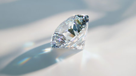 A detailed macro shot of a perfectly cut diamond sitting on a white background, highlighting the clarity and brilliance of the gem