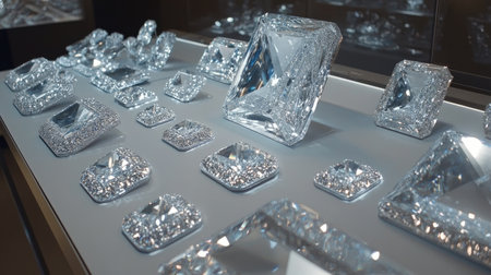 Medium shot of a sleek glass diamond display showcase with bright LED lighting highlighting sparkling gemstones blurred background emphasizing the brilliance of each diamond.
