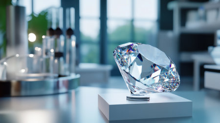 This captivating image features a gorgeous crystal diamond presented elegantly on a minimalist base. The backdrop highlights a stylish, modern interior filled with soft natural light, creating an atmosphere of luxury and sophistication. Perfect for promoting elegance and beauty.