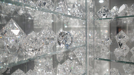A breathtaking collection of clear crystals and diamonds arranged on glass shelves, offering an enchanting ambiance with a sparkling display and soft bokeh effect.