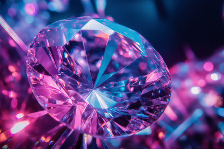 Close up of a large faceted diamond shining under pink and blue lights, creating a mesmerizing display of color and brilliance