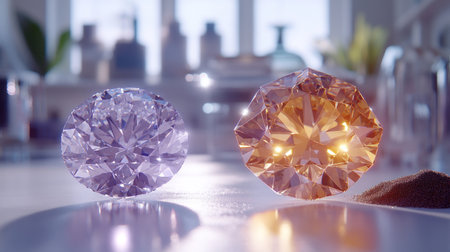 Two stunning gemstones shine in the warm light of a modern lab.