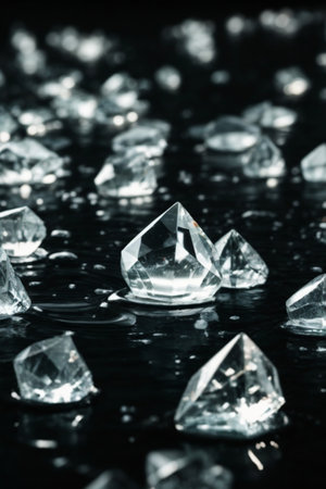 Captivating image showcasing a mesmerizing display of multifaceted diamonds floating on a captivating liquid surface