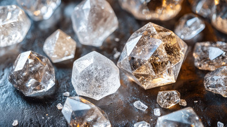 A stunning arrangement of sparkling crystal diamonds laying on a softly blurred background. This composition highlights elegance, luxury, and beauty, perfect for various themes.