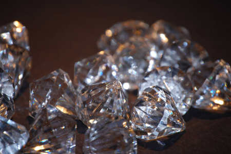 A scattering of small shiny diamonds lies on the table surface