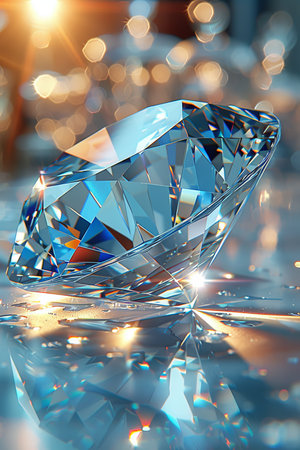 Large, sparkling diamond resting on a dark blue reflective surface, creating a luxurious and elegant atmosphere with a beautiful bokeh effect in the background