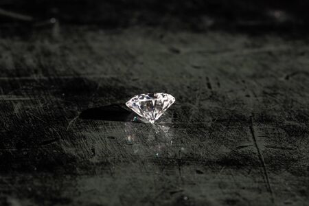 A brilliant diamond sits on a dark, textured surface, reflecting light and showing its facets in detail.