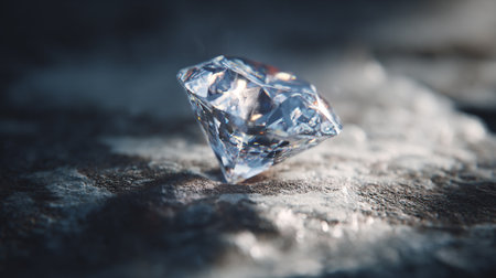 A stunning diamond shines brightly on a rocky surface, showcasing its brilliant cut and exceptional clarity. The natural lighting brings out its intricate reflections.