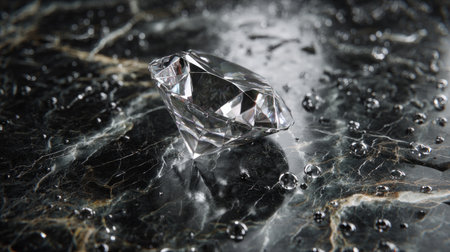 A stunning diamond rests on a dark marble surface, adorned with glistening water droplets that enhance its sparkle, embodying luxury and sophistication in design.